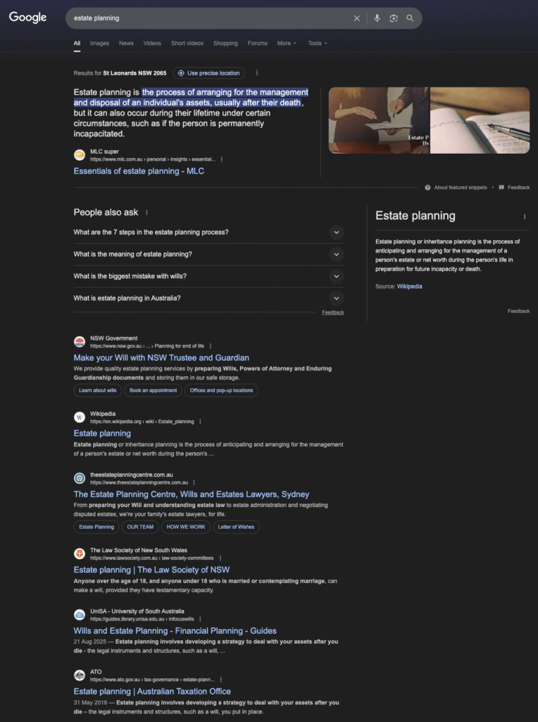 Five out of ten results are law firms with identical messaging about “protecting your assets” and “avoiding probate complications.” Their websites feature stock photos of elderly couples looking worried about paperwork. The content focuses on legal technicalities and tax minimisation strategies.