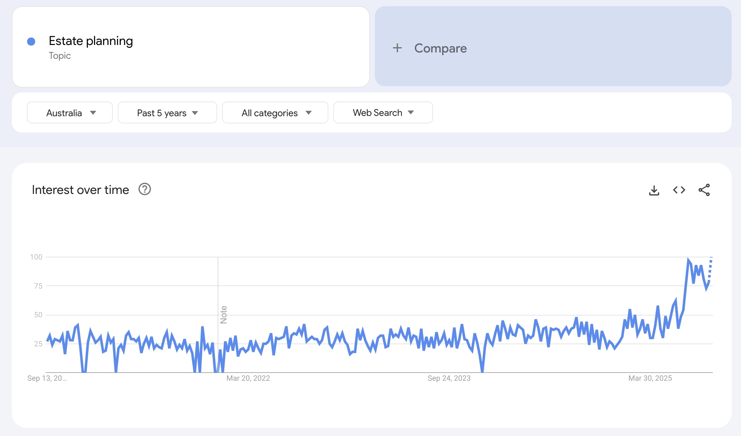 Yet here’s what’s fascinating: Google Trends data shows Australian interest in “estate planning” is at an all-time high. Australians are searching for estate planning information more than ever before.